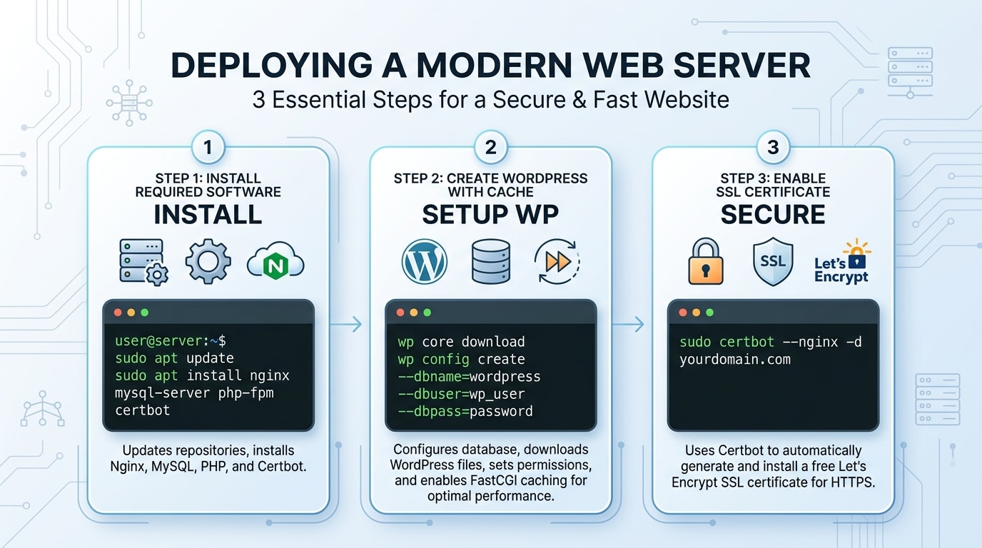 Bài nguồn mô tả quy trình khá thẳng: chọn VPS, khởi tạo Ubuntu, truy cập SSH, cập nhật hệ điều hành, mở các cổng cần thiết, cài Webinoly, tạo website WordPress có FastCGI Cache, bật SSL rồi cấu hình bảo vệ khu vực đăng nhập.
