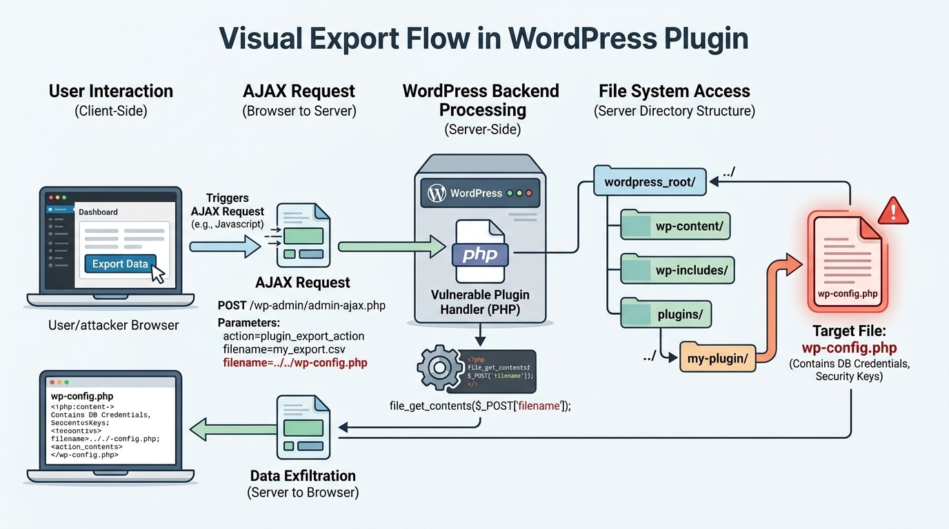 Đây là lỗi cho phép đọc file tùy ý trên server thông qua một luồng export của plugin. Nghe có vẻ kỹ thuật, nhưng hiểu đơn giản là một người dùng không nên có quyền xem file hệ thống lại có thể lách qua chức năng export để lấy nội dung file ngoài phạm vi bình thường.