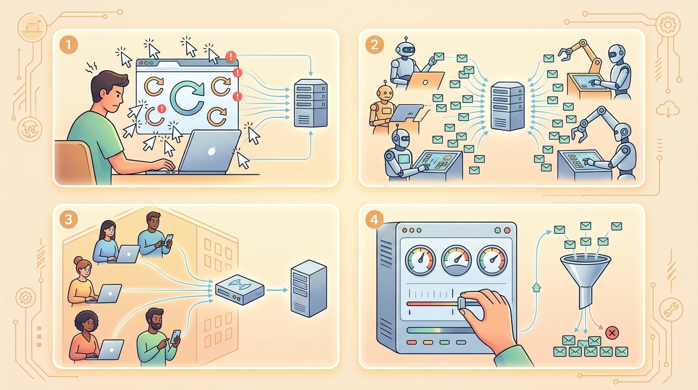 Điểm quan trọng là lỗi này không nhất thiết chứng minh bạn làm gì sai theo nghĩa “xấu”. Nó chỉ cho thấy hành vi truy cập của IP đó đã chạm ngưỡng mà rule hiện tại cho phép. Điều này có thể đến từ bot, script tự động, crawler, tiện ích trình duyệt quá tích cực hoặc thậm chí từ người dùng thật nhưng bấm tải lại quá nhiều.