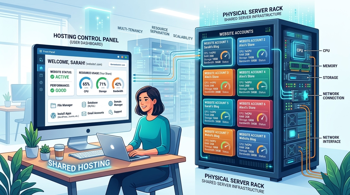 Điểm cần hiểu cho đúng là: Hosting không phải “máy chủ riêng mini”. Nó thường là môi trường nhiều người dùng chung một máy chủ vật lý hoặc cụm tài nguyên, sau đó nhà cung cấp dùng các cơ chế cô lập và giới hạn để mỗi tài khoản không ảnh hưởng quá mức tới tài khoản khác. Chính vì vậy, Hosting mạnh ở sự tiện lợi và ổn định vận hành, chứ không mạnh ở quyền kiểm soát sâu.