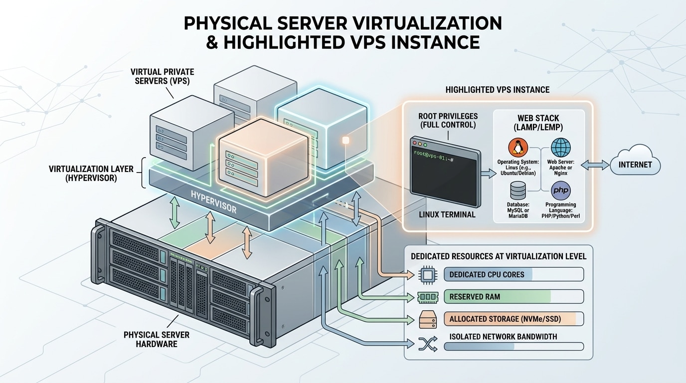 VPS là một máy chủ ảo được tạo ra bằng công nghệ ảo hóa trên một máy chủ vật lý dùng chung. Điểm khác lớn so với Hosting là bạn nhận một môi trường riêng có hệ điều hành riêng và quyền kiểm soát sâu hơn. Bạn có thể xem nó như một “server của riêng mình” ở cấp phần mềm, dù phía dưới vẫn là hạ tầng chia sẻ vật lý.