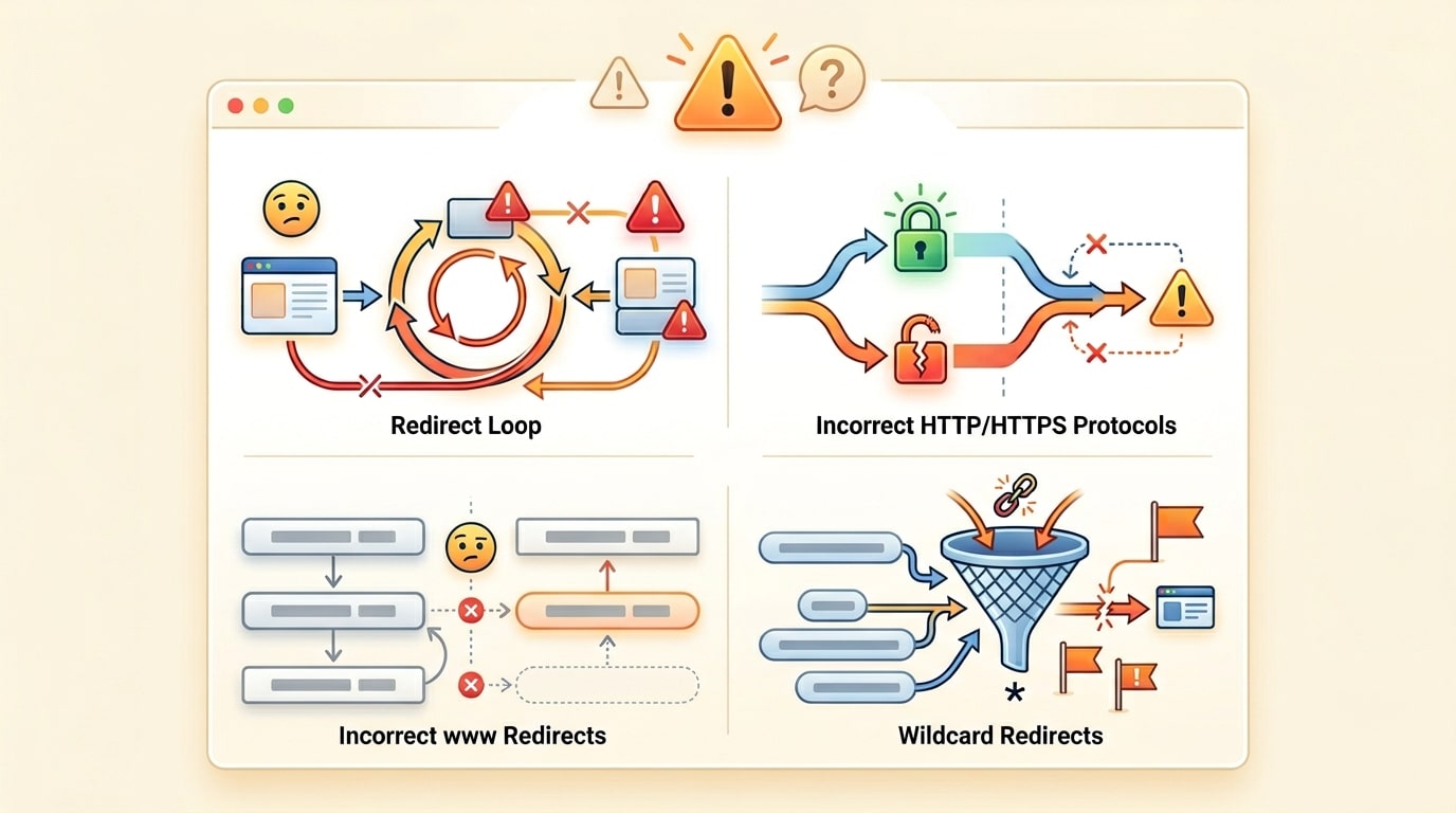 - Tạo chồng nhiều redirect: có thể làm phát sinh vòng lặp hoặc chuỗi chuyển hướng dài không cần thiết.