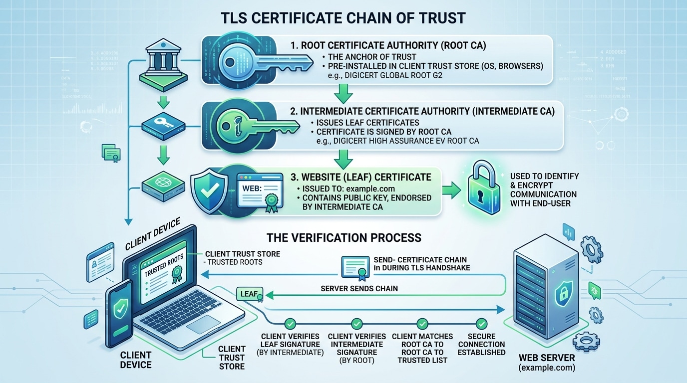 Một phiên TLS không được tin cậy chỉ vì website tự đưa ra một certificate và tự nhận mình hợp lệ. Trình duyệt hoặc client phải lần theo một chuỗi xác minh. Chuỗi đó thường bắt đầu ở leaf certificate của website, đi lên intermediate certificate, rồi kết thúc ở một root certificate đã nằm sẵn trong trust store của hệ điều hành hoặc trình duyệt.